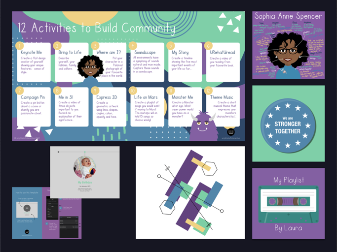 12 creative activities to build community and unleash creativity. This pack includes; instructional file with teacher created examples, 7 templates for students, a custom font, and a 30 second animation that can be used in student projects.